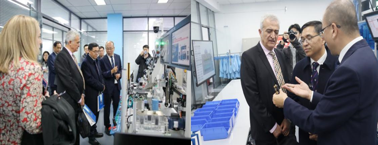 代表团参观了机器人综合实践工作站、物联网实践平台、自动化装配线、VR实训教学等。