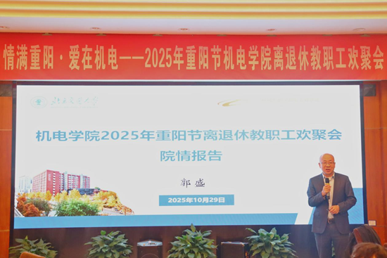 调教 院长郭盛作院情报告。他围绕学院高质量发展,从人才培养、科学研究、国际交流等多个维度介绍了近期取得的新局面、新突破。郭盛强调,学院今日的成就,深深得益于老一辈打下的坚实基础和持续关怀,他代表学院向全体离退休教师致以衷心感谢,并期待大家继续贡献智慧,携手传承“诚朴务实、创新进取”的机电精神,共筑发展新篇章。